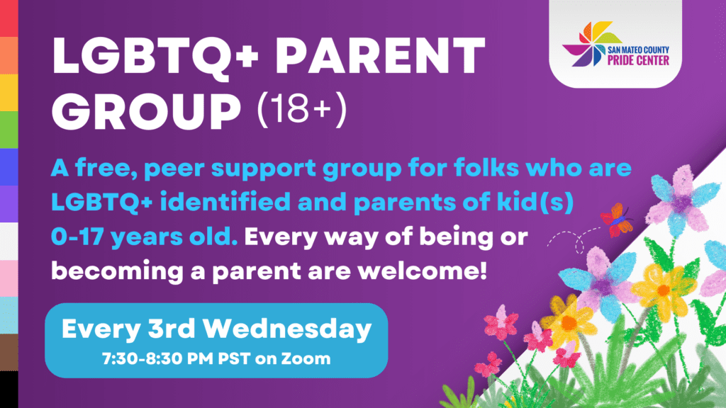This group is a free group open to all LGBTQ+ folks age 18+ who are parents of kid(s) 0-17 years old as a place to support each other, share parenting wisdom, and build community. This group is for parents who identify as LGBTQ+. If you are a parent of a child who identifies as LGBTQ+, please visit PFLAG for additional resources and more. For information about SMC’s local PFLAG chapter, click this link.
